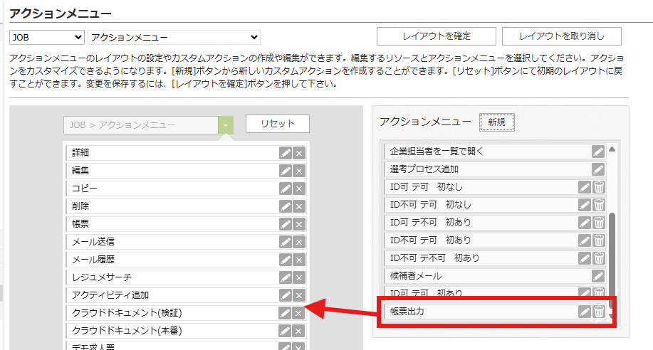 6.追加したアクションメニューは右の[未使用メニュー]に保存されるため、左側[使用メニュー]に移動してレイアウトを確定します。
