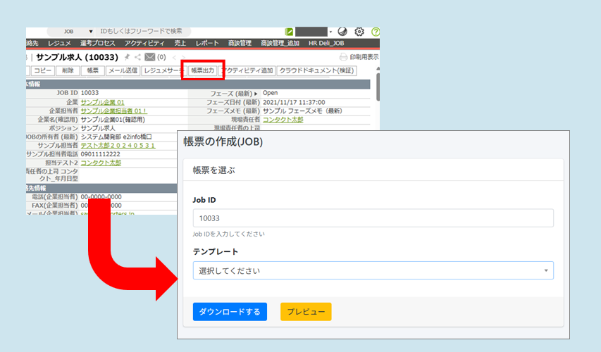 上記設定を終えますと、PORTERSに設定いただいたアクションメニューからクラウドドキュメントに遷移し、出力が可能となります。