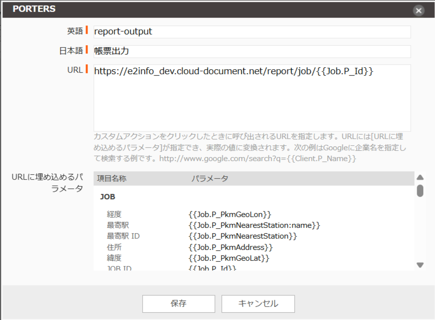 出力IDをクラウドドキュメントに反映するにはURLにある{{〇〇.P_ID}}のパラメータが、PORTERS側の[URLに埋め込めるパラメータ]に含まれている必要があります。