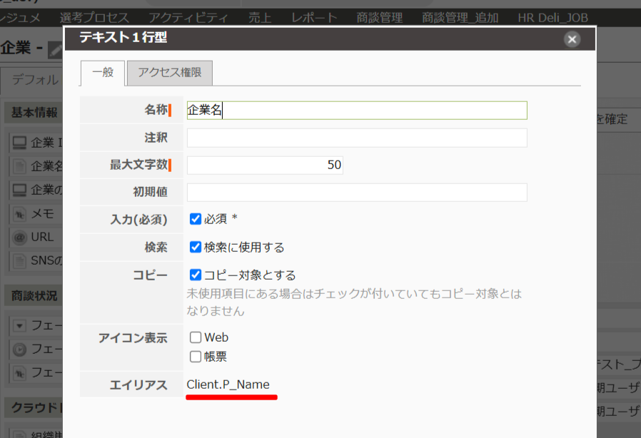2.PORTERSのカスタマイズ画面より、確認する項目の編集画面からエイリアスを確認します。