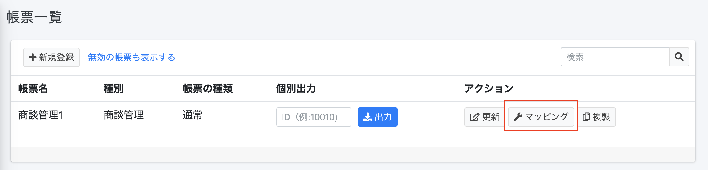 1.「帳票一覧」を選択し、右側の「アクション」にある[ マッピング ]を押下します。