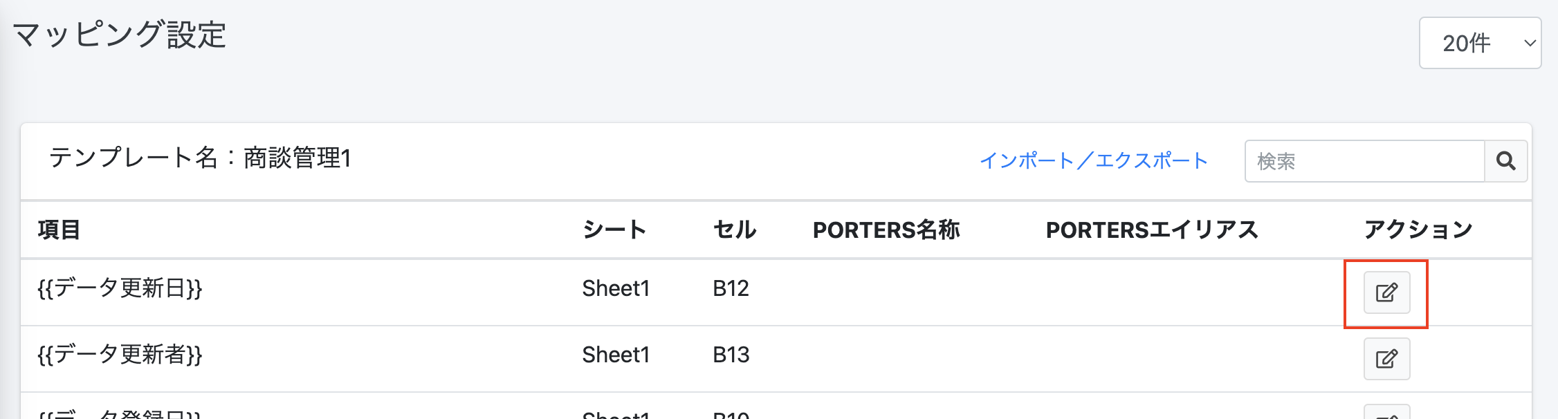 2.「マッピング設定」に遷移するので、右側の「アクション」にある「更新」アイコンを押下します。