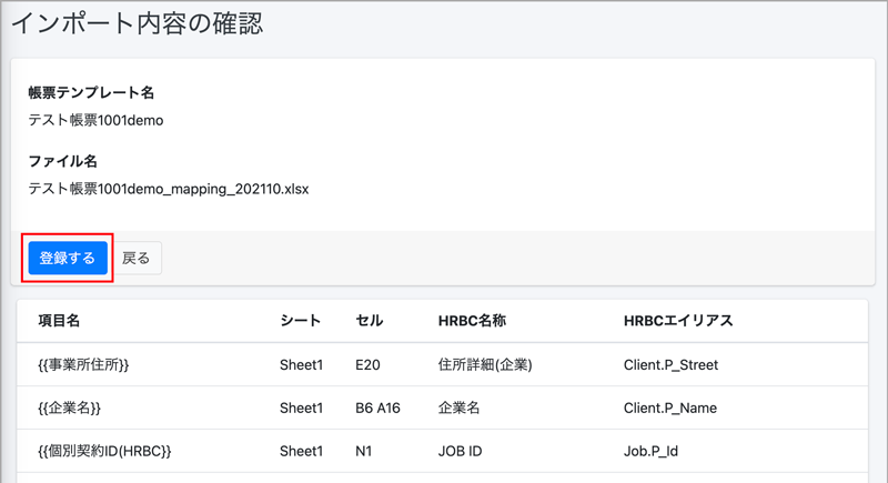 4.インポートした内容が表示されますので、内容を確認し、問題がなければ[ 登録する ]を押下します。