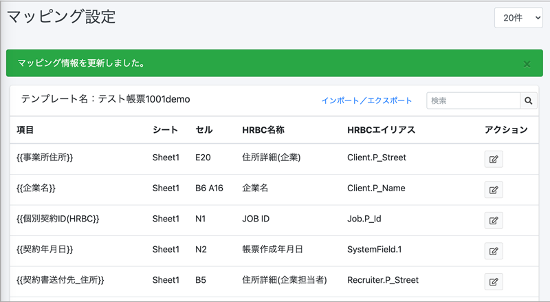 5.「マッピング情報を更新しました。」とメッセージが表示されたらインポート完了です。