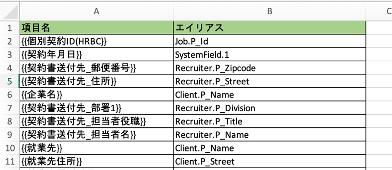 1.[ エクスポート ]では設定済みの「項目」と「エイリアス」の一覧表をExcelにてダウンロードが可能です。