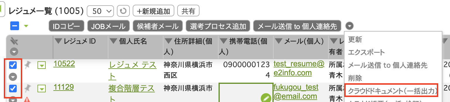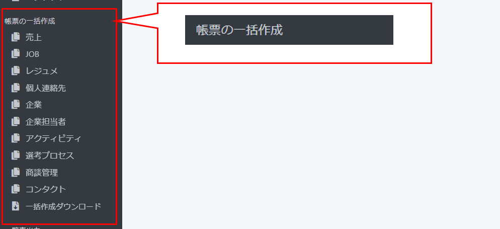 アクションメニュー → レジュメまたは売上またはJOBを選択 → 一括アクションを選択します。