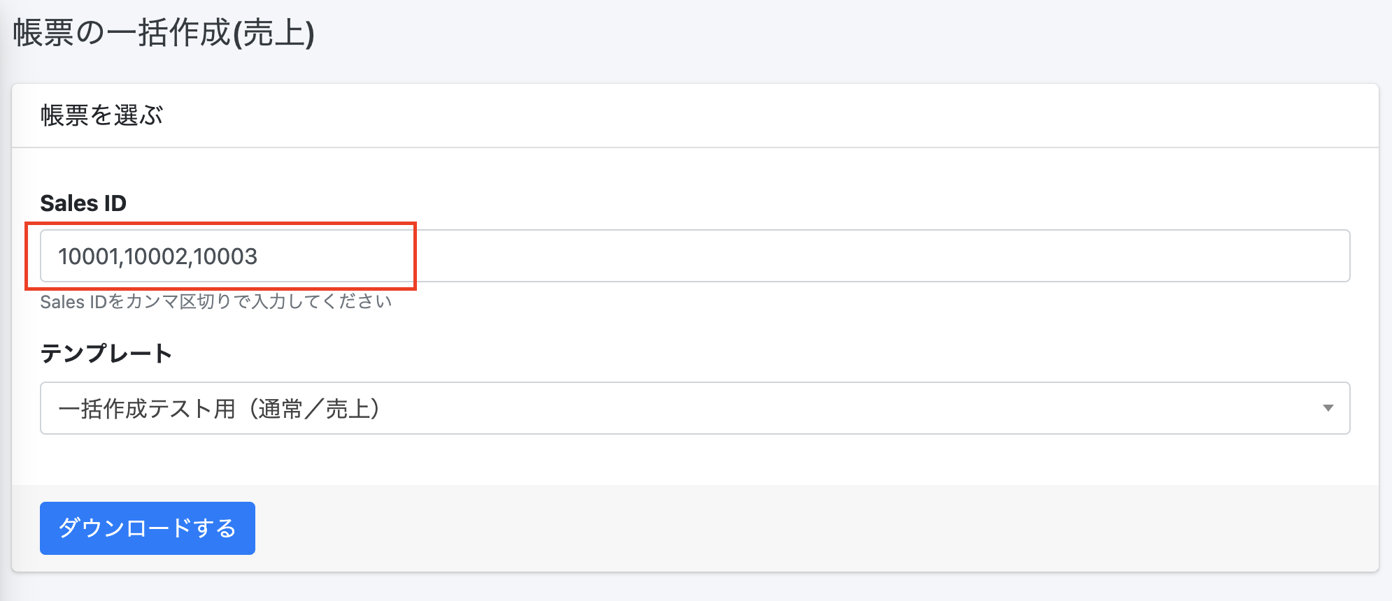 2.出力したいIDをコンマで区切り入力し、テンプレートを選択して[ ダウンロードする ]を押下します。