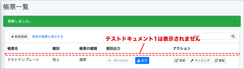 テンプレートが作成されると「帳票一覧」に遷移し、「更新しました」とメッセージが表示され、作成したテンプレートが表示されます。