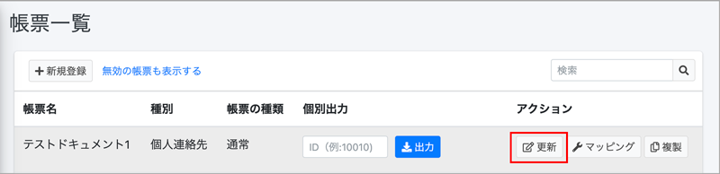 1.「帳票一覧」を選択し、右側の「アクション」にある[ 更新 ]を押下します。